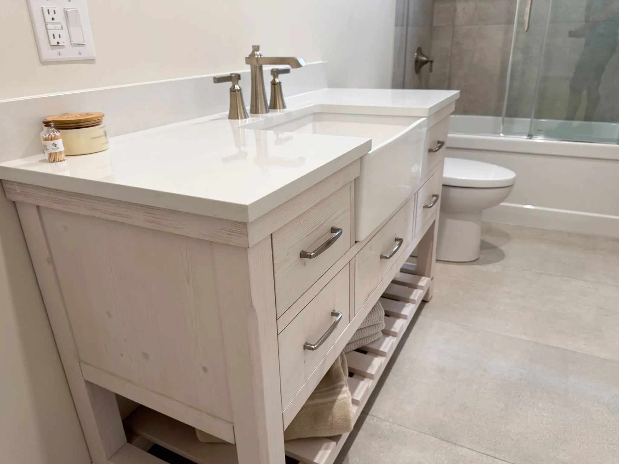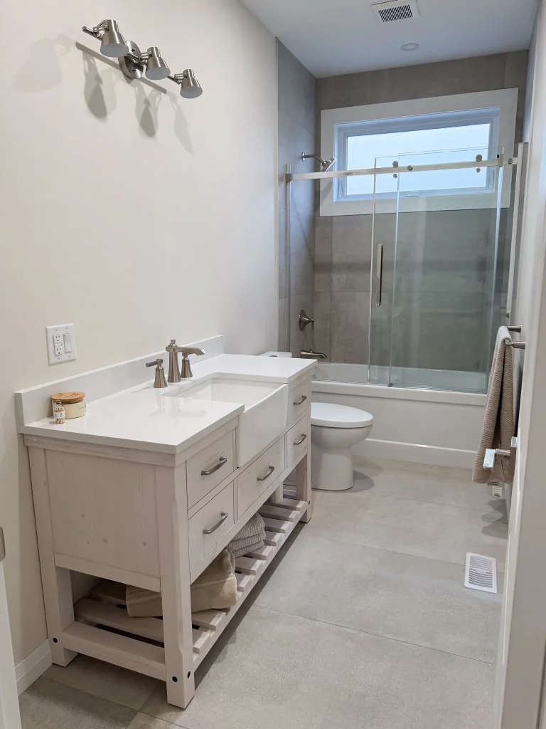 Throughout the home, every detail supports a balance of form and function. The bathroom pairs a farmhouse-inspired vanity with an apron-front sink and open shelving, while large-format tile lends a modern touch. Ample windows in each room bring in natural light and frame views of the surrounding landscape. From entryway to back deck, this home is designed to feel effortless, warm, and livable—where classic farmhouse charm meets modern simplicity.