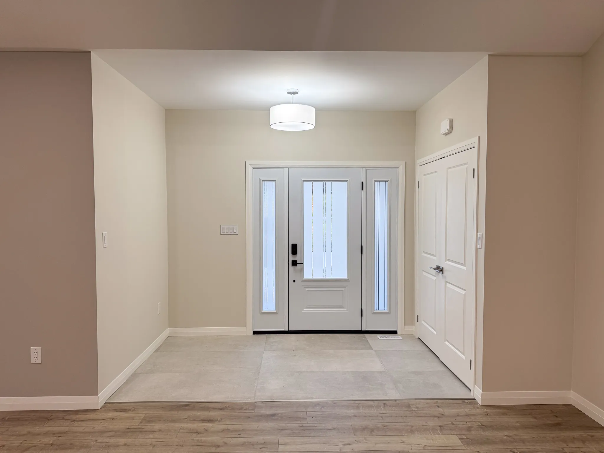 Inside, the open-concept layout is anchored by vaulted ceilings and wide-plank flooring in soft wood tones, creating a spacious and airy feel. The kitchen features white shaker-style cabinetry, stainless appliances, and quartz countertops, including a large central island—perfect for gathering or meal prep. Thoughtful lighting, clean trim lines, and brushed hardware add polish without overpowering the space, allowing the craftsmanship and materials to shine.