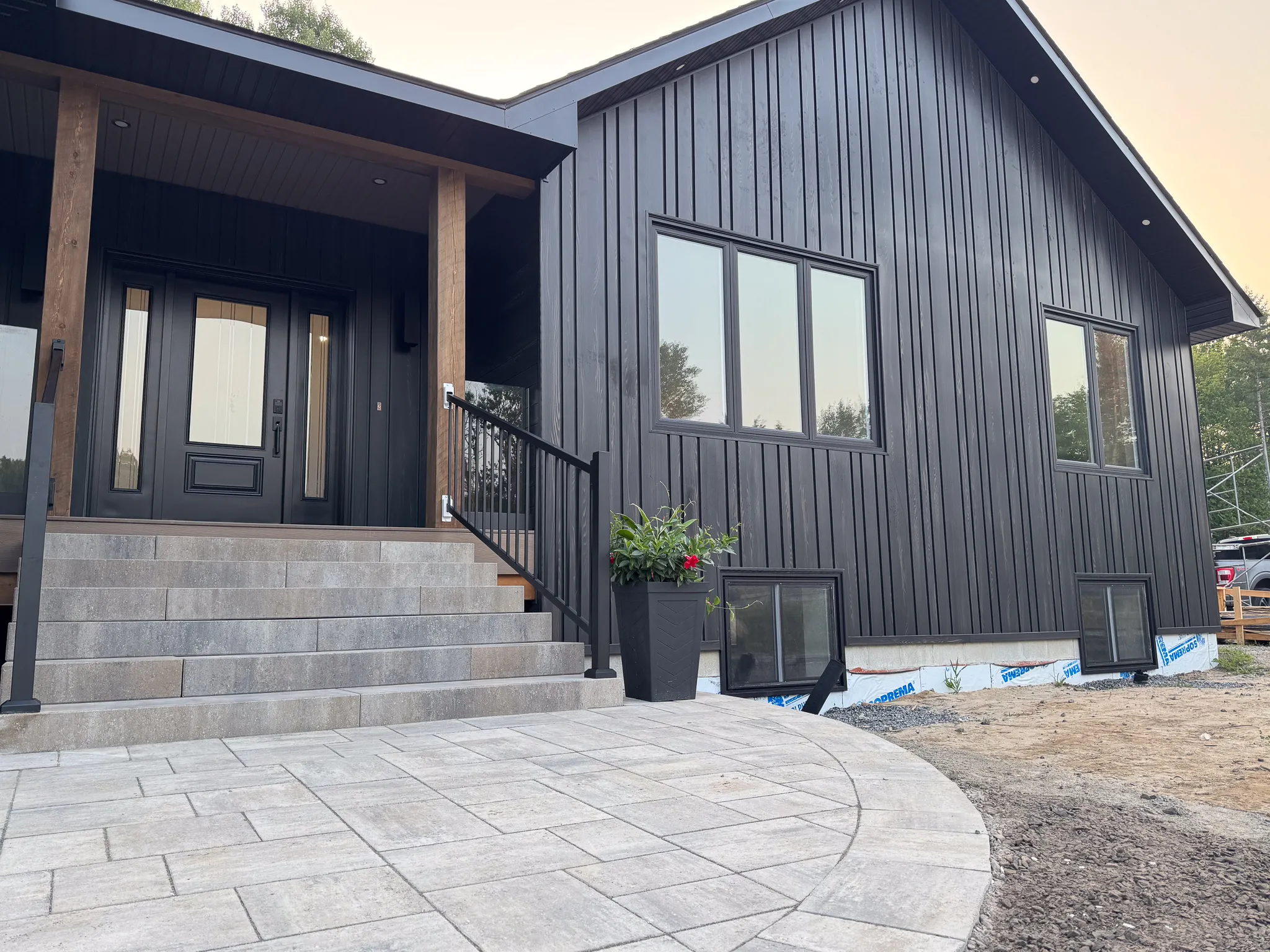 The exterior is bold yet inviting, with deep black vertical siding, warm wood accents, and wide stone steps that lead to a striking matte-black front door. The overall palette is natural and neutral, setting the tone for the calm, understated elegance found throughout the home.
